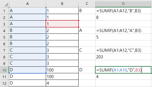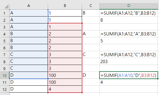 - Range는 12개이지만 Sum_range는 9개이므로 반복문은 9까지만 돌고 종료된다. 즉, A11과 A12는 사용자가 범위에 설정했지만 실제로는 찾지 않는 값이다. 그래서 A10의 D를 찾고 그 결과가 B12의 4로 출력된다.