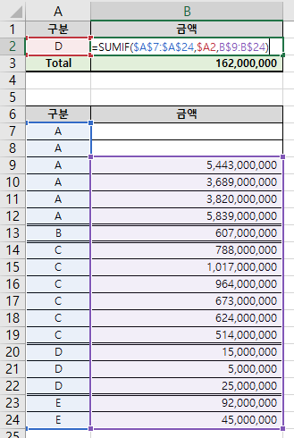 아래는 구분이 D인 데이터의 금액 합계를 구하는 수식이다 (실제 회사 데이터를 정리한 예제).