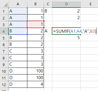 추측한 대로 A의 Sum_range는 3, 4, 5행에서, C의 Sum_range는 9, 10, 11에서 찾았기 때문에 각각 5와 11이라는 결과를 출력하는 것을 알 수 있다. 여기까지는 생각이 맞았다. 그러나, D의 경우 4를 출력하고 있다. 왜 그럴까?